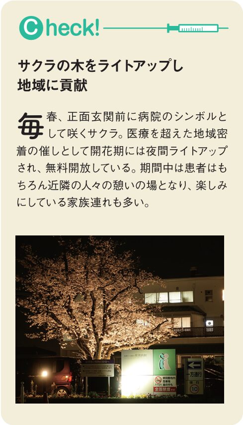 「高齢の患者さんは、日常生活において介助が必要なケースが少なくありません。入院中はもちろん、退院後も関連施設をとおして、訪問・通所リハビリテーションを継続的に提供できることが当院の強みです」と院長。同院はコミュニティホスピタルの魁として、総合診療の側面から診ると同時に、専門的な治療が必要な場合、更には退院後の患者の生活をサポートする場面で、多様な医療機関との連携の起点となる役割を担っているといえそうだ。