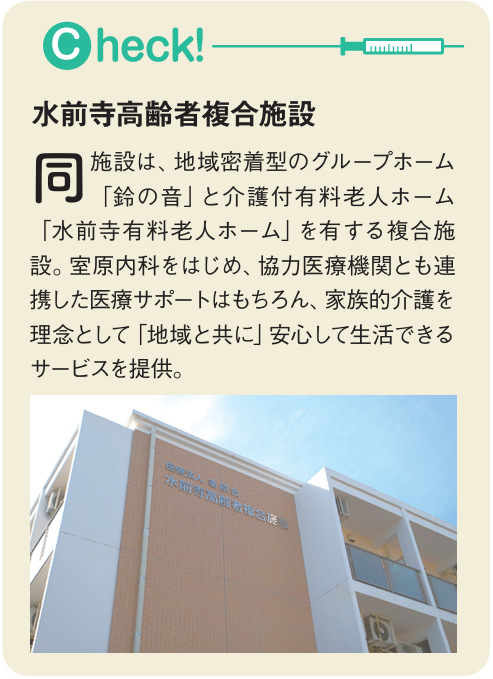 創始者、院長、そして若きドクター、3世代それぞれのスタイルで常に時代を先駆けながらも、コミュニティホスピタルの精神が脈打っている印象を受ける。経験豊富な総合診療ができることは、高齢者診療の重要性が増していく現代の医療機関として、大きな強みになるに違いない。院長は締めくくるように、「患者さんは家族と離れ入院するだけで、心理的・身体的に落ち込んでしまいます。自宅で治療できるなら最善ではないでしょうか。点滴や輸血、レントゲンなど、在宅でできる治療はたくさんあります。住み慣れた家で家族に看取られ最期を迎える、その有り様は日本人の心に馴染むのだと思っています」と語った。