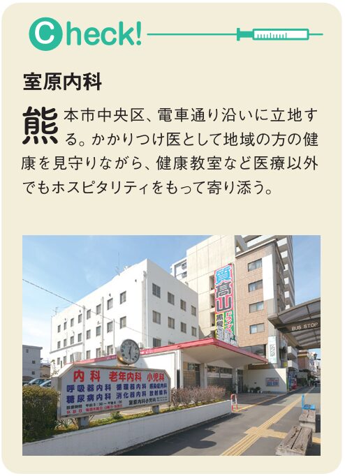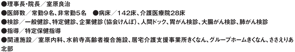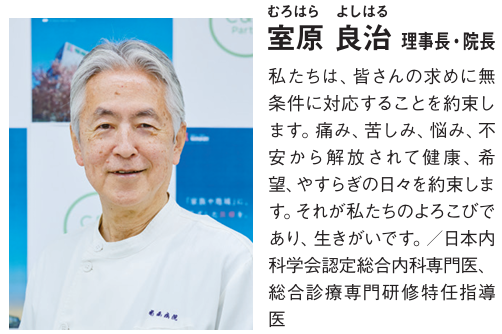 「当院はクリニックでもない大病院でもない、地域の住民を支える中核病院です。コミュニティホスピタルとして患者さんの人生に寄り添い、『治し、支える医療』を目指します。医療従事者が地域の方々の元へ出向き、人生を一緒に伴走していこうという思いです」と室原良治院長は力を込める。1972年開院以来、地域のかかりつけ医であり続ける同院のモットーは〝3つのS 相談・即入院・紹介〞。「患者さんの気持ちに寄り添い、耳を傾け、必要であれば入院対応。また、半世紀を超える実績から適切な医療機関をスピーディーに紹介する医療機関連携も確立しています」。