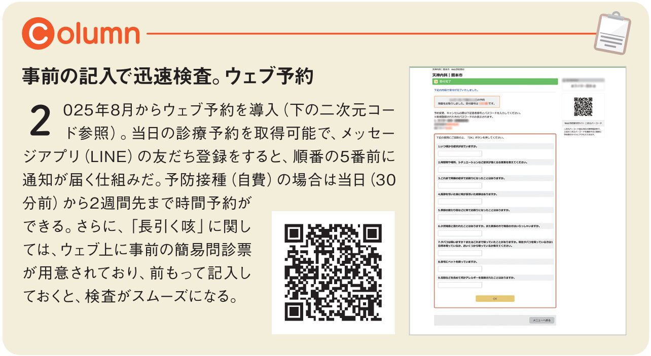 さらに、新たに患者のストレスを少なくする取り組みも始めた。その一つが、2025年8月からスタートした「ウェブ予約」だ。当日のみ予約を取ることができ、かつ順番が近くなったら携帯電話に知らせが届く仕組み。「待ち時間が短くなるため、特に子育て世代に好評です」。とりわけ咳に関しては簡易問診もウェブサイト内で記入が可能。先に記入をしておくとすぐに検査できるメリットも。地域のかかりつけ医としての役割の上に、呼吸器疾患、生活習慣病といった専門性を加えた天神内科。長引く咳が気になる方は相談してほしい。