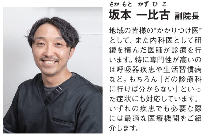 一方で、〝かかりつけ医〞としての地域貢献も忘れてはならない。幅広い世代が集まる大江地区で、日常のちょっとした体調不良など一般内科の診療も全般的に対応。一般検診に加えインフルエンザや肺炎球菌、帯状疱疹といった予防接種も広く受け付けている。加えて完全に別の入り口・別棟に「発熱外来(完全予約制)」を完備。感染リスクのある患者は駐車場からそのまま受診が可能だ。もちろん感染対策も整えられている。また、足が不自由になるなど同院に通えなくなった地域の高齢患者への在宅診療も行っている。「ずっと通ってきてくださった患者様で『今さら別の医療機関にかかるのはいやだから』とお声を掛けていただいています」。坂本副院長は、地域医療機関としての責任感をにじませる。