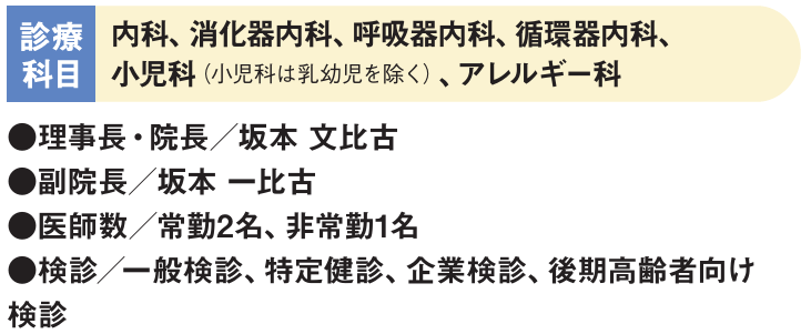 同クリニック内には胸部レントゲンはもちろん、胸部CTなど、肺機能検査、呼気NO、睡眠時無呼吸検査ができる機器・設備が整えられており、呼吸器異常に関するあ る程度の検査がクリニック内で完結する。さらに検査の結果、肺病変や悪性所見が疑われる場合は専門医 療機関への紹介の流れがあるのも 強み。「3週間以上続く咳はさまざまな病気のリスクがあります。安心のためにも速やかな受診をお勧めします」と坂本一比古副院長。