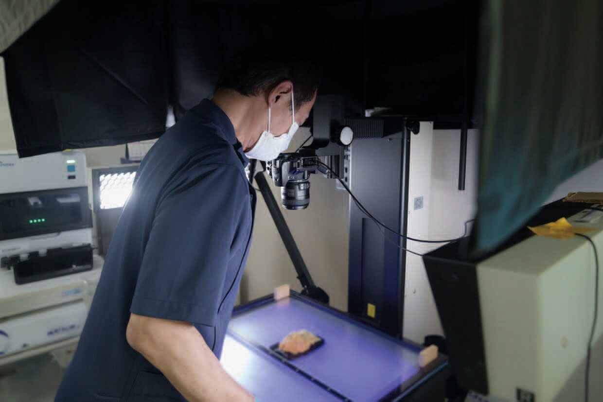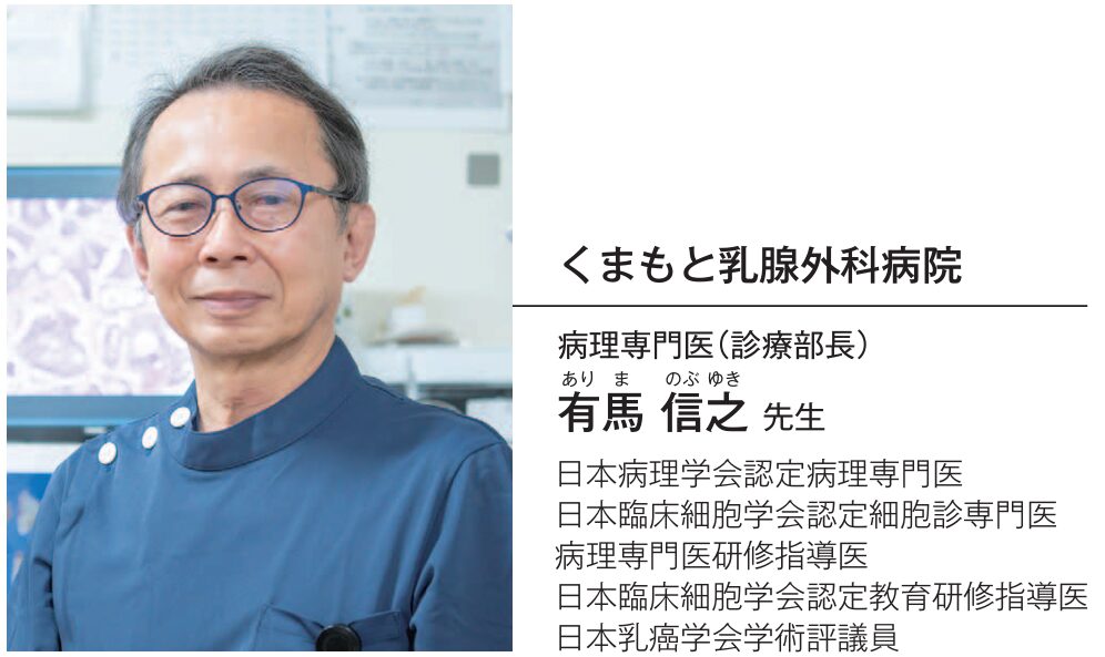 乳がんの診断には「病理診断」が欠かせない。視触診やマンモグラフィ、超音波、MRIといった画像診断を経て、最終的には患者から採取した細胞や組織を顕微鏡で観察し、良性か悪性か判断する必要がある。この病理診断の結果がその後の治療方針を大きく左右する。同院では、手術室に隣接した病理室・病理診断室を設置。診療部長として、九州でもトップクラスの乳がん症例の実績を持つ有馬信之病理専門医が在籍している。大きな総合病院以外で病理診断医が常駐するのは全国でも珍しいという。病理診断医が院内にいることで臨床医との情報共有がスムーズになる。診断が困難な症例や治療方針に迷う場合も、細やかな相談ができることで治療の質とスピードが向上する。具体的な利点の一つが手術中に行われる「センチネルリンパ節生検」。腋のリンパ節ががんに侵されているかを確認するために採取した検体を手術中に短時間で診断、不必要なリンパ節切除を回避することができ、患者の身体的負担を軽減しつつ、再手術のリスクを大幅に低減する。