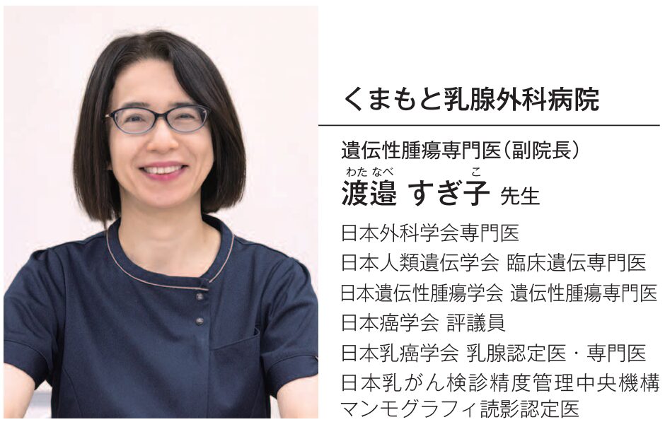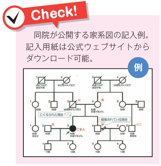 ただ、検査結果が陽性であっても、予防的手術を選ばず、定期的な経過観察や通常の乳がん検診を継続するという選択肢もある。つまり、予防的手術を行うか否かは患者の価値観やライフスタイルに大きく左右される。どのケースにおいても十分な情報提供と丁寧なカウンセリングが求められる。同院の遺伝カウンセリング外来では、こういった乳がん患者からの相談に応じ、検査や治療に関する幅広い選択肢の提示を行っている。一方で、まだ乳がんを発症していない人も遺伝カウンセリングを受けることが可能だ(乳がんの診断を受けていない場合は自由診療)。3親等内のがん既往歴から将来の遺伝性乳がん・卵巣がんの心配がある人はカウンセリング(1枠1時間程度・初診税込1万1千円)をお勧めしたい。いずれの場合も、家族歴が分かっていると相談がスムーズになる。同院では、公式ウェブサイトで家系図記入用紙を公開している。「どの検査・治療を選ぶかは患者さんの考え方次第。私たちは適切で正しい情報を充分提供し、患者さんがより良い選択ができるようサポートをするだけです。」と遺伝子腫瘍専門医である渡邉すぎ子副院長は語る。