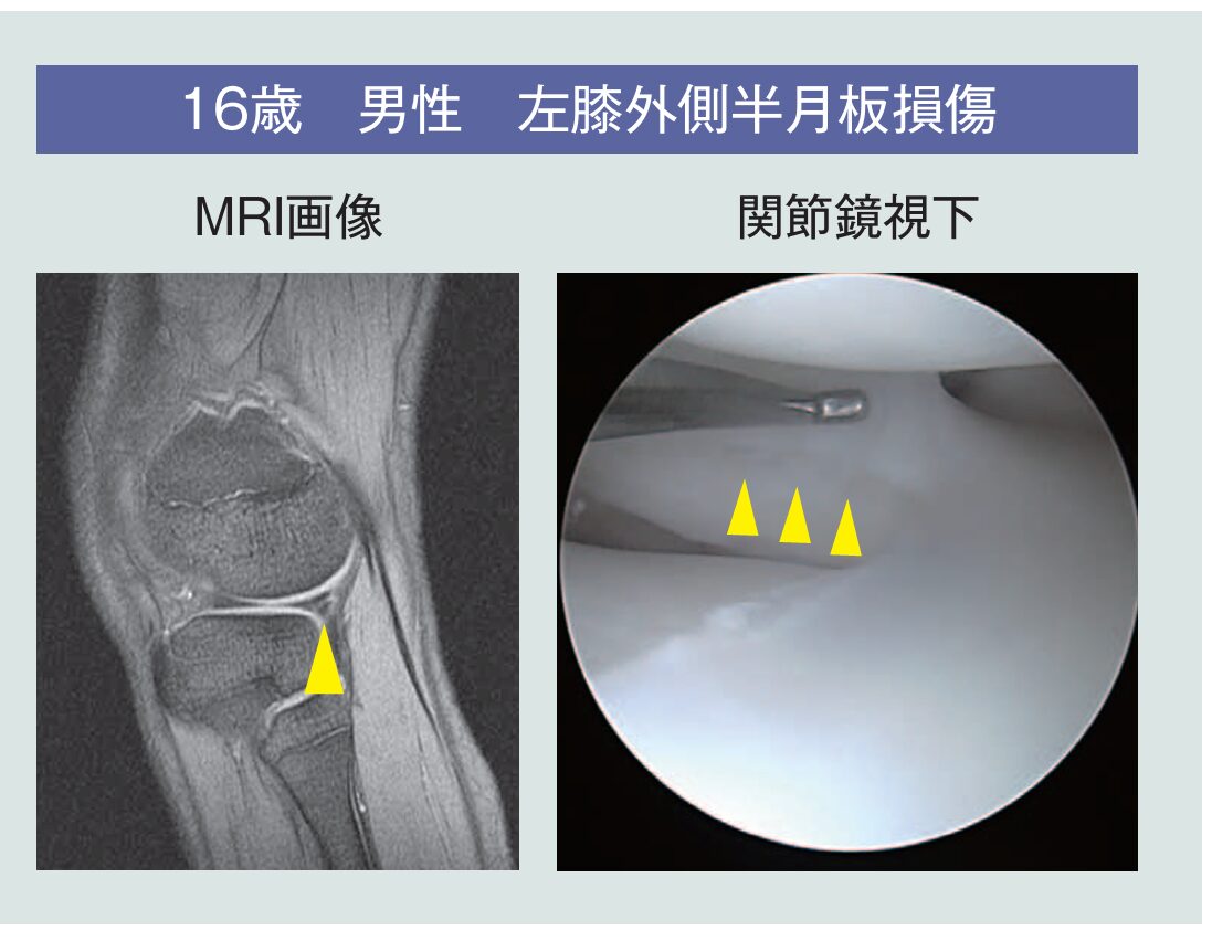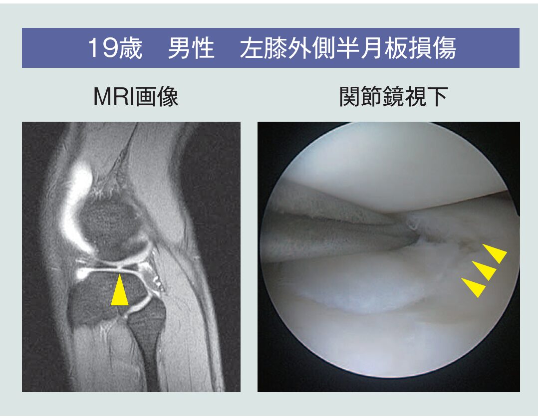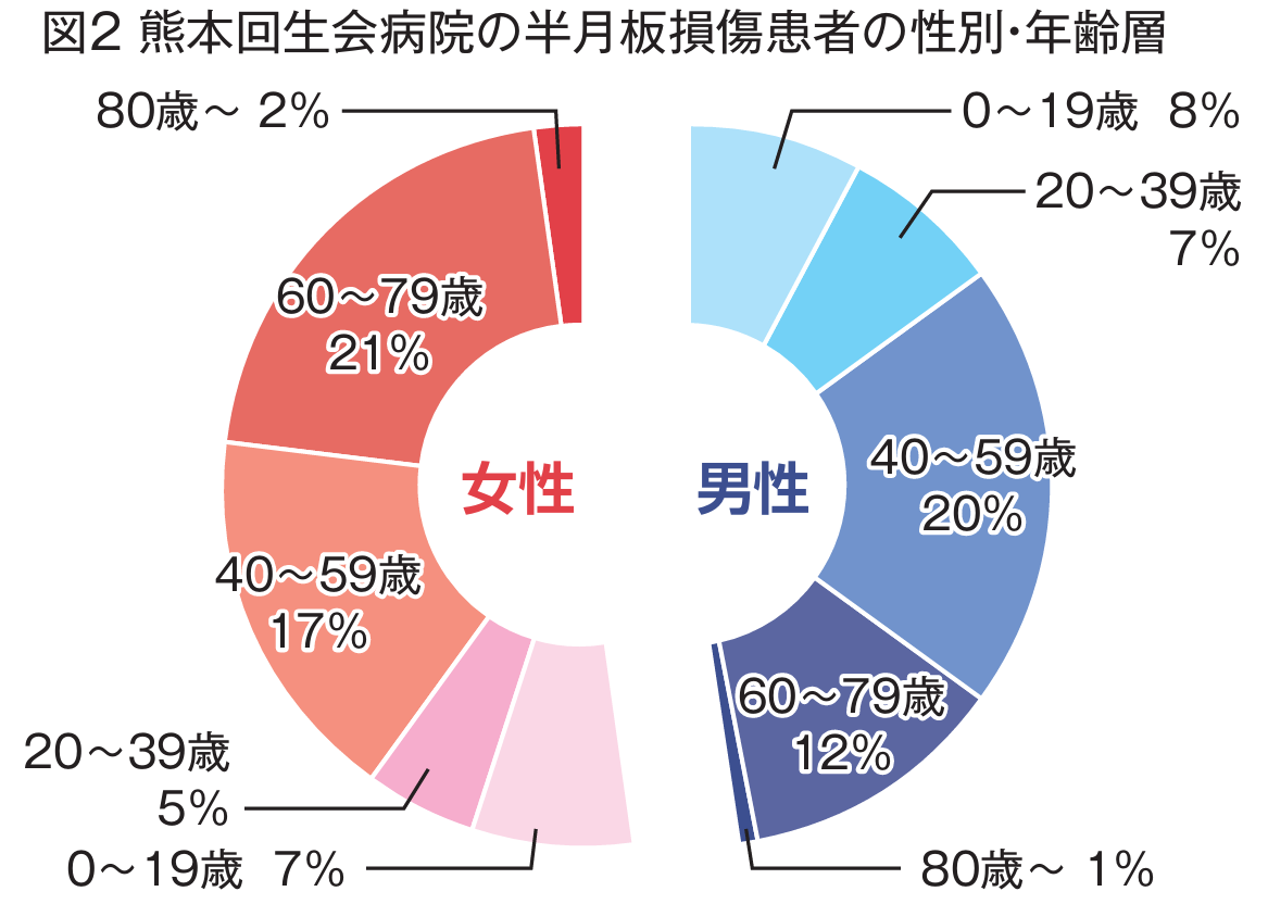 半月板が傷ついたことで膝の曲げ伸ばしの際に痛みや違和感が感じられ、日常生活やスポーツしづらくなるのが「半月板損傷」だ。同院では女性の患者が若干多いが、男女ともに10代以降にまんべんなく発症。特に40代以上が7割を占めている。サッカーやバスケットボールといったスポーツ中のけがや、転倒・転落などによって引き起こされることもある(外傷性)一方で、誘引された理由が不明なケースが半数以上となっている。そもそも半月板は、日頃のひねり・ねじり・しゃがみ動作などで少しずつ切れていく。生まれた直後には最大量だった半月板内の水分量は成長するにつれ減っていき、水分を保持するコラーゲンの質の変化(変性)が起こる。二足歩行とともに自然と変性が始まり、20代で少なからず傷が見られ、40代以降はさらに傷は顕著になるという。その結果、変性した半月板に微弱な力が加わって損傷する半月板損傷(変性断裂)もあるという。よって、「誘引不明」の半月板損傷のうち、加齢による変性が原因となるケースもあると予想される。
