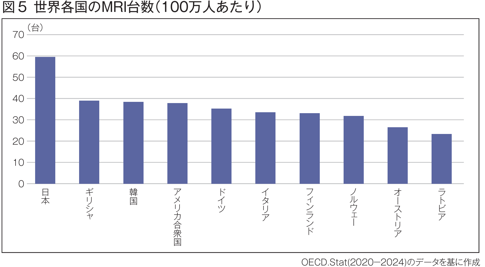 しかしながら現状として、今でも半月板損傷➡切除手術の流れは多いという。「温存する」世界の流れに逆らうようだが、温存するための手術には高い技術と豊富な経験が必要なため、現在も切除手術といった治療法を取る医療機関が少なくない。さらに鬼木院長は大きな課題として「MRI画像ありきの診断」を挙げる。日本は人口100万人あたりのMRI台数が約60台と世界1位(図5)。2位のギリシャの約40台と比べても特出して多く、いわば「気軽にMRIを撮りやすい環境」が整っている。多くの医療施設がMRIを持っているがために、膝の痛みを訴える患者をMRI撮影➡半月板に「傷」を発見➡即手術となるケースが少なからず見られるという。加えて、MRI画像を読み取る専門的知識の不足も鬼木院長は指摘する。「MRIの画像で見ると、正常な半月板と傷ついた半月板の違いや加齢のための変性と損傷の区別は非常に困難です。