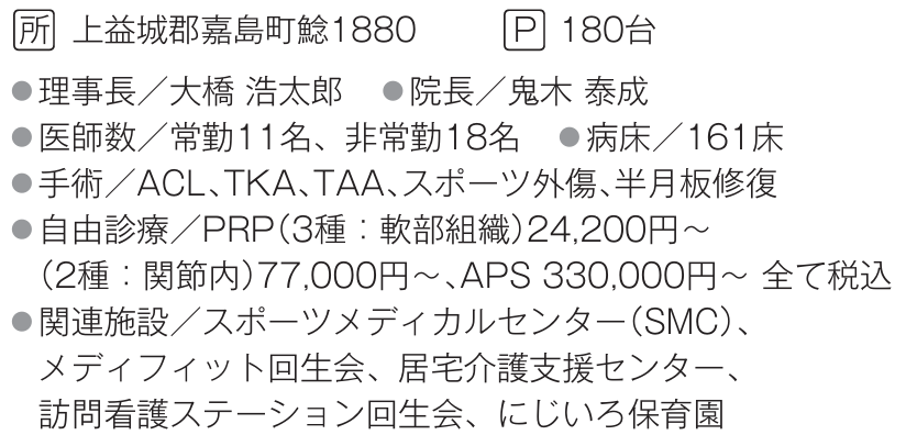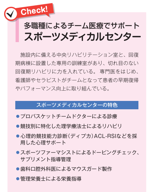 加えて、半月板と膝にストレスを掛けないために、重力に逆らう「抗重力筋」の訓練も必要。筋力を付け、正しい力の入れ方をトレーニングすると膝にかかる力を和らげることができる。ここで注意したいのは、ジムなど一般的な筋力トレーニングでは逆に膝にストレスがかかること。医学的なリハビリテーションの要素を持った筋力訓練が欠かせない。同院が併設しているスポーツメディカルセンターのような、医師の監修を受けた施設が望ましいという。もう一点言及すべきなのは、半月板にはほとんど血行がないこと。血液が通っていないということは、経口摂取の薬剤やサプリメントの効果は届きづらく、サポーターや痛み止めも意味がない。また、血液が届かないことから再生や再建ができず、自然治癒も望めない。「だからこそ、まずは関節内注射、筋力の向上で痛みを押さえることを治療のスタートとするべきです」と鬼木院長。