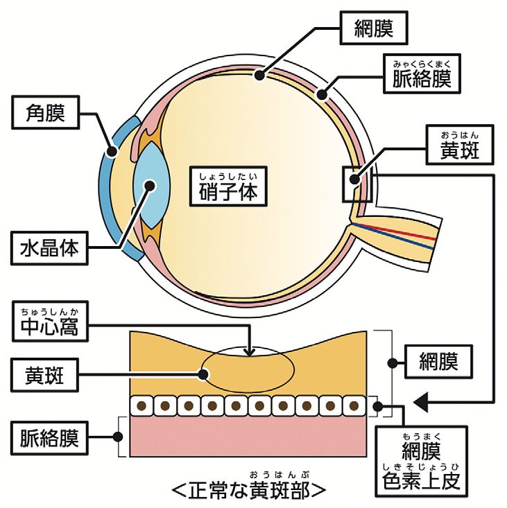 物が見えるのは、眼の中に光が入り、頭の中で映像として認識されるためだ。まず瞳孔から光が入り、水晶体で屈折、硝子体を通り、網膜に到達する。カメラに例えると水晶体はレンズ、網膜はフィルムの役割を果たしている。 黄斑はこの網膜のほぼ中央にあり、物の詳細を見極めたり、文字を読んだりするのに欠かせない部分だ。この黄斑の変化によって起こる疾患を「加齢黄斑変性」と呼んでいる。日本では50歳以上の80人に1人に見られ、加齢とともに頻度は高くなる。また、患者数も年々増える傾向にあるという。