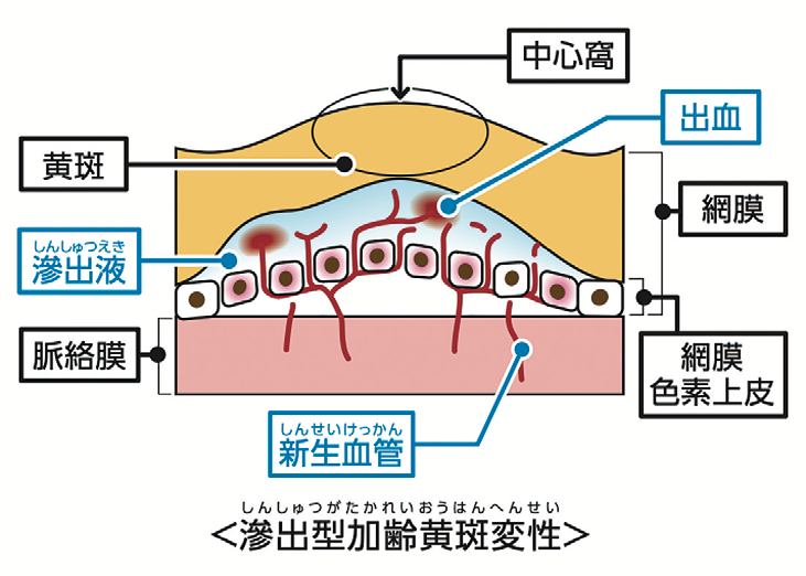 特に日本人に多いのは、「滲出型加齢黄斑変性」。黄斑部分の老廃物(ドルーゼン)を排出する力の低下によって、老廃物が沈着、網膜に異常をきたす。すると「新しい血管を作れ」という誤った指令が眼に届き、黄斑の裏側に病的な「新生血管」を生じる。本来発生してはいけない場所に血管ができることで、視界の中心が見えづらくなる。さらにこの血管はもろく破れやすいため、血管中の水分(滲出液)や血液そのものが漏れ出て、黄斑部分にたまってしまう。「人生百年時代、長生きをしているからこそ、知っておいてほしい疾患の一つです」と岩上院長は指摘する。